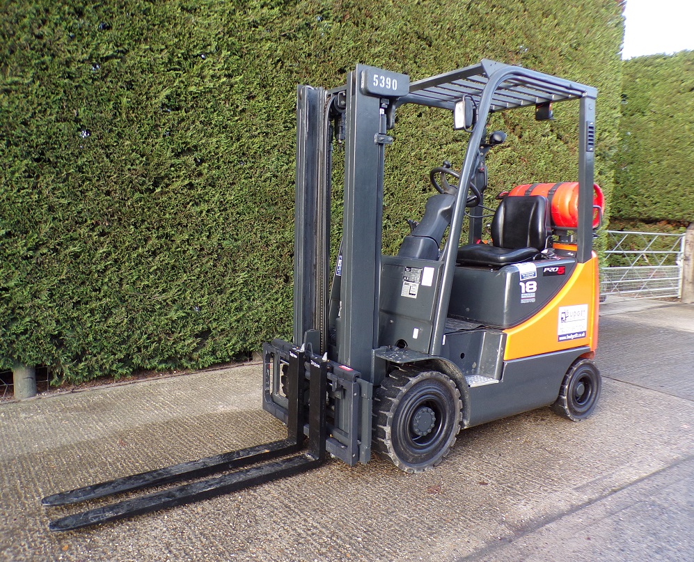 5390 Doosan G18S-5 1800kg gas counter balance with a duplex 3000mm lift height & closed height of 2180mm with sideshift.