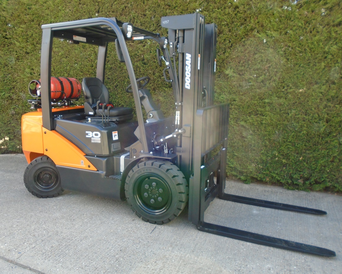 5337 Doosan G30P-7 3000kg gas counter balance with a triplex 4730mm lift height full free lift mast & closed height of 2180mm with sideshift.